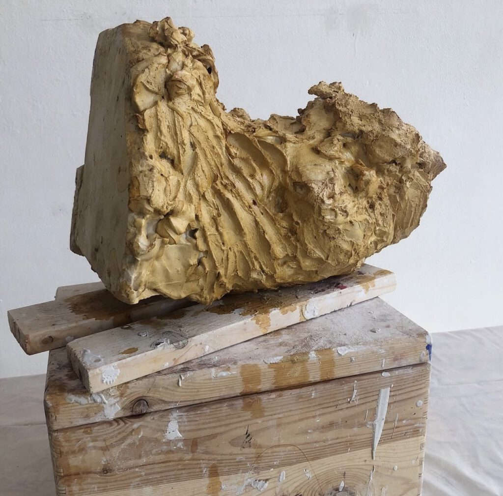 Installation - Held Form Held Form – sculptural object (plaster, shellac), wooden box, table, plastic foil / skulpturalem Objekt (Gips, Schellack), Holzkasten, Tisch, Kunststofffolie, variable dimensions / variable Maße, 2020