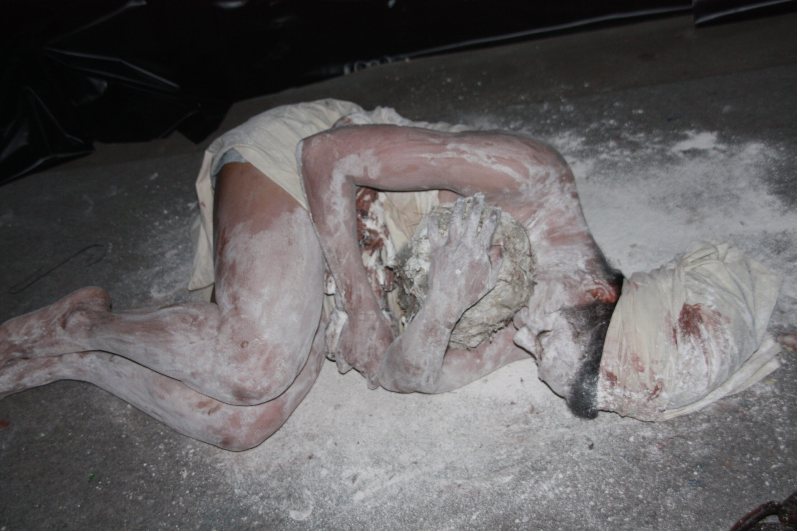 Wrapped in fabric and dusted with plaster, the artist moves through darkness. The body becomes surface and threshold—between light and shadow, presence and trace. A sculpted head is held and caressed, a quiet dialogue of touch, memory, and belonging.